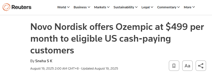 8 月 19 日,据外媒Reuters报道,诺和诺德宣布将 Ozempic 在美国的售价降至每月 499 美元,专为无法通过医保获得药物的患者,同时首次提供送药上门服务。此前,未投保患者需支付约 1,000 美元,相较之前价格砍半。